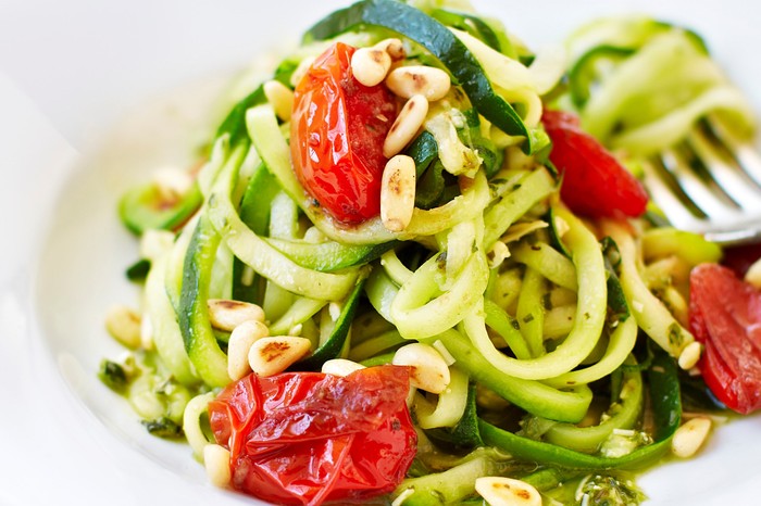 Who needs pasta when you can have spiralized courgette? Try our easy courgetti recipe, made with baby plum tomatoes, garlic, pesto, pine nuts and a lot of courgette noodles. We are made about spiralizing, so we've created a list of our favourite courgetti recipes.