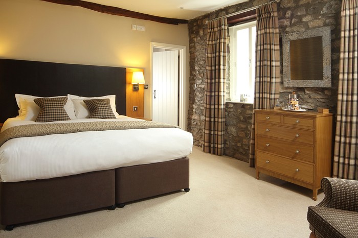 Wood-beamed rooms are decorated with hunting scenes and local wildlife from local artists. Sheepskins, woollen rugs and quilted blankets add a cosy touch to crisp white bedding. Some rooms include a free-standing bath, showers are powerful and fragrant with sage and geranium Bamford botanical products.