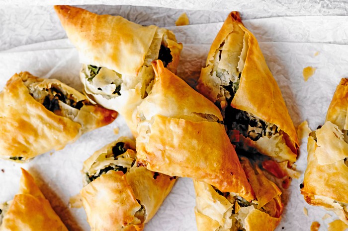 Preserved lemon isn’t the predominant flavour in these little spinach, feta and onion parcels, but they add something extra to the classic combination. You could add it to most spinach dishes for a fragrant hint, including spinach and mushroom pilaf, veggie lasagne or creamed spinach.