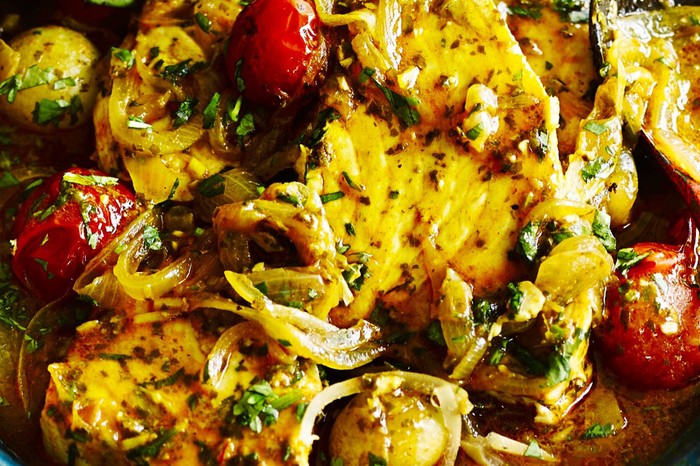 Preserved lemon is great in fresh tomato fish curries, such as this chermoula tomato and fish tagine. This one is spiced with cumin, coriander, saffron and lemon juice. Serve with buttered couscous and a dollop of harissa for a quick but impressive main.