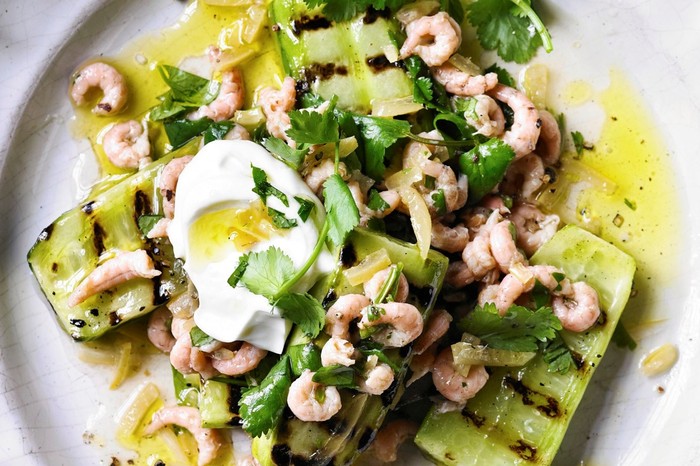 Whoever thought of griddling cucumbers is a genius. We’re fully on board. This griddle cucumber recipe and preserved lemon recipe comes topped with sweet brown shrimp, coriander and yogurt. By mixing fresh lemon juice and preserved lemon peel, you get a really rounded lemon flavour which works well in this fresh dish. Spinkle over some toasted flaked almond and serve with crusty ciabatta for a main, or divide between small plates for a beautiful summery starter.