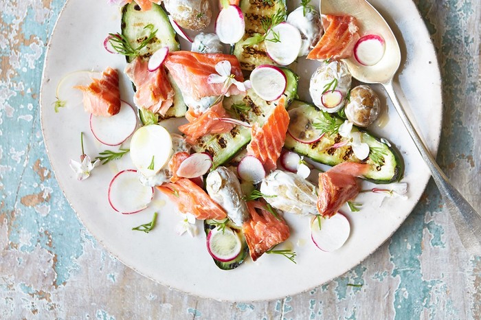 Our smoked trout, new potato and grilled cucumber salad is a great light and healthy dish to make for a summer BBQ. You need a BBQ with a lid that closes and wood chips to create the smoke for the trout and potatoes. If you don’t want to smoke your own fish, you can use lightly smoked raw trout or salmon and cook it in the oven instead.