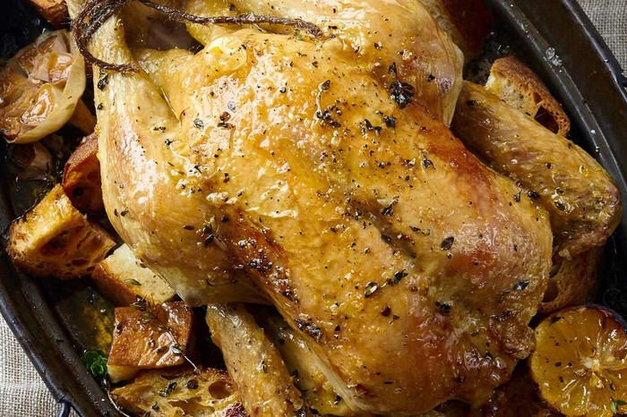Roast chicken with garlic and thyme croutons