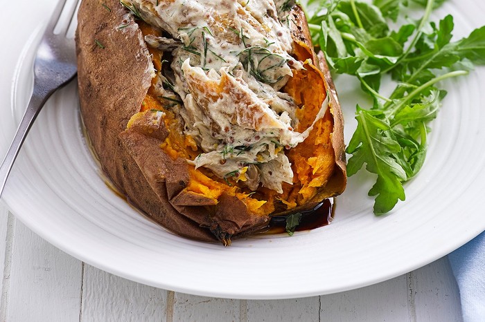 Smoked mackerel and dill yogurt is an easy, healthy way to spice up sweet potato jackets