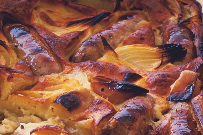 Toad in the hole is a great family sharing dish that everyone loves. This version adds wedges of onion and flavours the batter with mustard powder. Serve with a big jug of hot gravy to pour over.